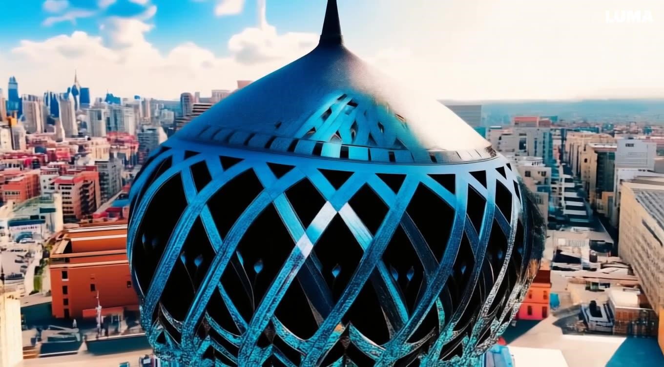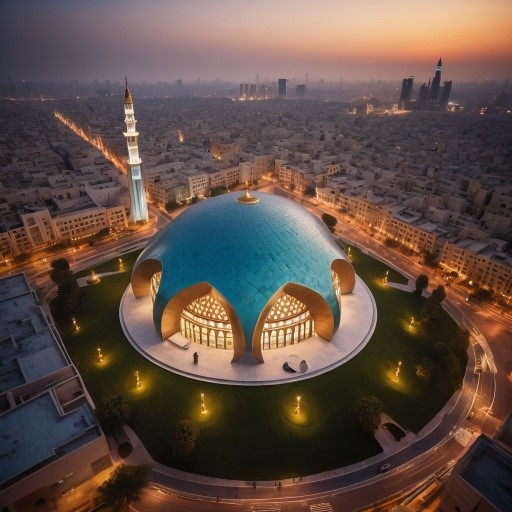“The Towering circular base Mosque, a modern hybrid structure reminiscent of the sphinx, stands tall against the backdrop of a bustling city. Its sleek, modern design reflects the mystical essence of holographic architecture, while its reflection leaves the city in a mesmerizing display. The building, adorned with intricate geometric patterns and futuristic designs, seems to blend seamlessly with the surrounding architecture. The radiance of the mosque’s architecture is a mesmerizing contrast of natural and urban life, a testament to the power and ambition of modern architecture.”