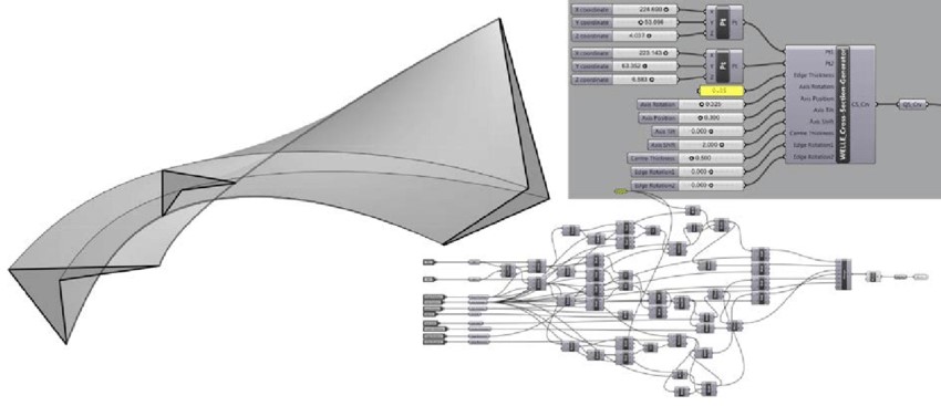 - عبر أدوات مثل Rhino/Grasshopper يتم تعديل المتغيرات (مثل الطول، العرض، الانحناء) لتغيير التصميم بالكامل بطريقة ديناميكية.