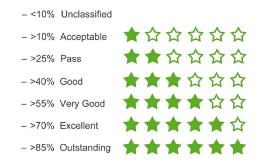 يوفر BREEAM تقييما شاملا نحو القيم المستدامة. ويغطي صافي الكربون الصفري، والتأثير الصحي والاجتماعي، والأداء الحياتي الكامل، والتنوع البيولوجي، والمرونة، والإفصاح والإبلاغ، وتصنيف الاتحاد الأوروبي (نظام تصنيف للأنشطة الاقتصادية المستدامة بيئيًا).