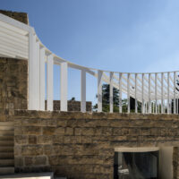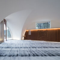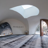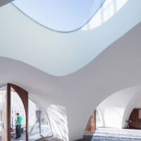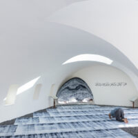 استدعى الهيكل القائم الحد الأدنى من التدخل، وتضمن ذلك ” تبييض” الأسطح المقعرة للأقبية الداخلية، باستخدام خليط خاص من الطلاء المصنوع من الحجر الجيري والذي تم جلبه من حلب في سوريا، فضلاً عن استحداث فتحة سقفية جديدة تقطع المساحة المقببة و تحدد اتجاه القِبلة نحو مكة المكرمة، كما وتلقي بالضوء باتجاه المحراب. ومن خلال هذه الفتحة السقفية ، يمكن للمرء أن يرى المئذنة في حلقة بصرية مذهلة من الخارج عائدة إلى المساحة الداخلية، كما وتربط بصريًا الإنفصال في المساجد التقليدية بين الصوت و الرؤية.
