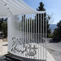 عندما يتحرك أحدهم حول المسجد، تصبح القراءة المستوية للمسجد التي شكلتها الألواح الفولاذية شفافة، بينما تصبح كلا من كلمتي ( الله)  و( الإنسان) أكثر وضوحاً، والعكس صحيح. كما أن الخفة الكلية للحجم الهيكلي للمسجد توضع أيضًا في علاقة تناقضية مع الثقل الحجمي لأحجار قصر المختارة.