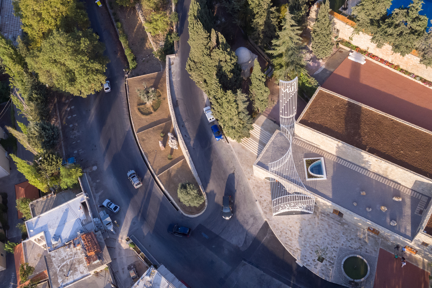 كما و تظلل شجرة التين الساحة الجديدة، مُشّكلًة الصورة النهائية مع شجرة الزيتون الموجودة على الجانب الاخر من الشارع، في إشارة واضحة لآية ” التين و الزيتون” ( سورة التين) في القرأن الكريم، ومشيرة أيضًا لأهميةِ كِلتَا الشجرتين في التقاليد المسيحية. عند عتبة مدخل قاعة المسجد، المخصصة للنساء والرجال في ذات المكان، يوجد بابان خشبيان مفصولان وغائران بواجهات زجاجية محفورة على شكل مربعات.