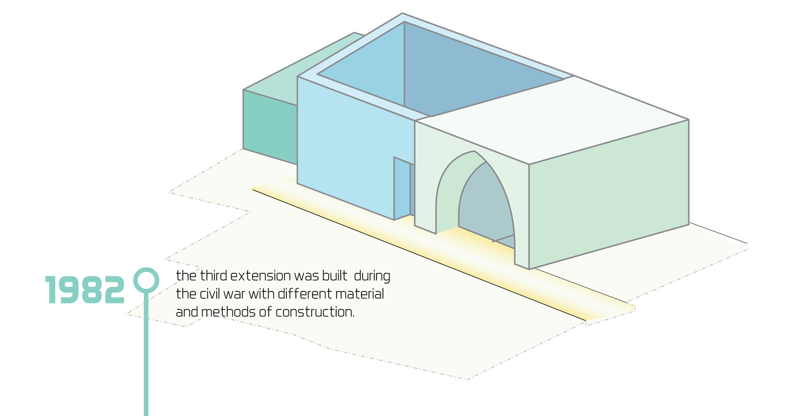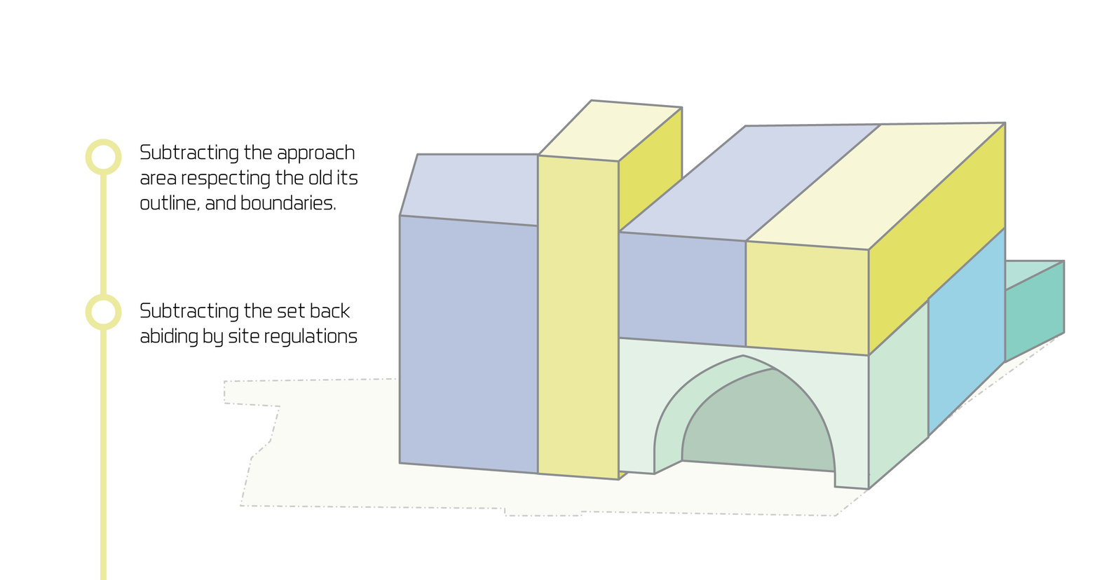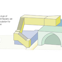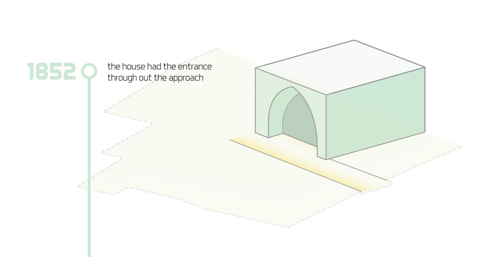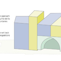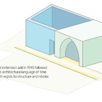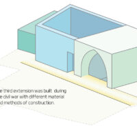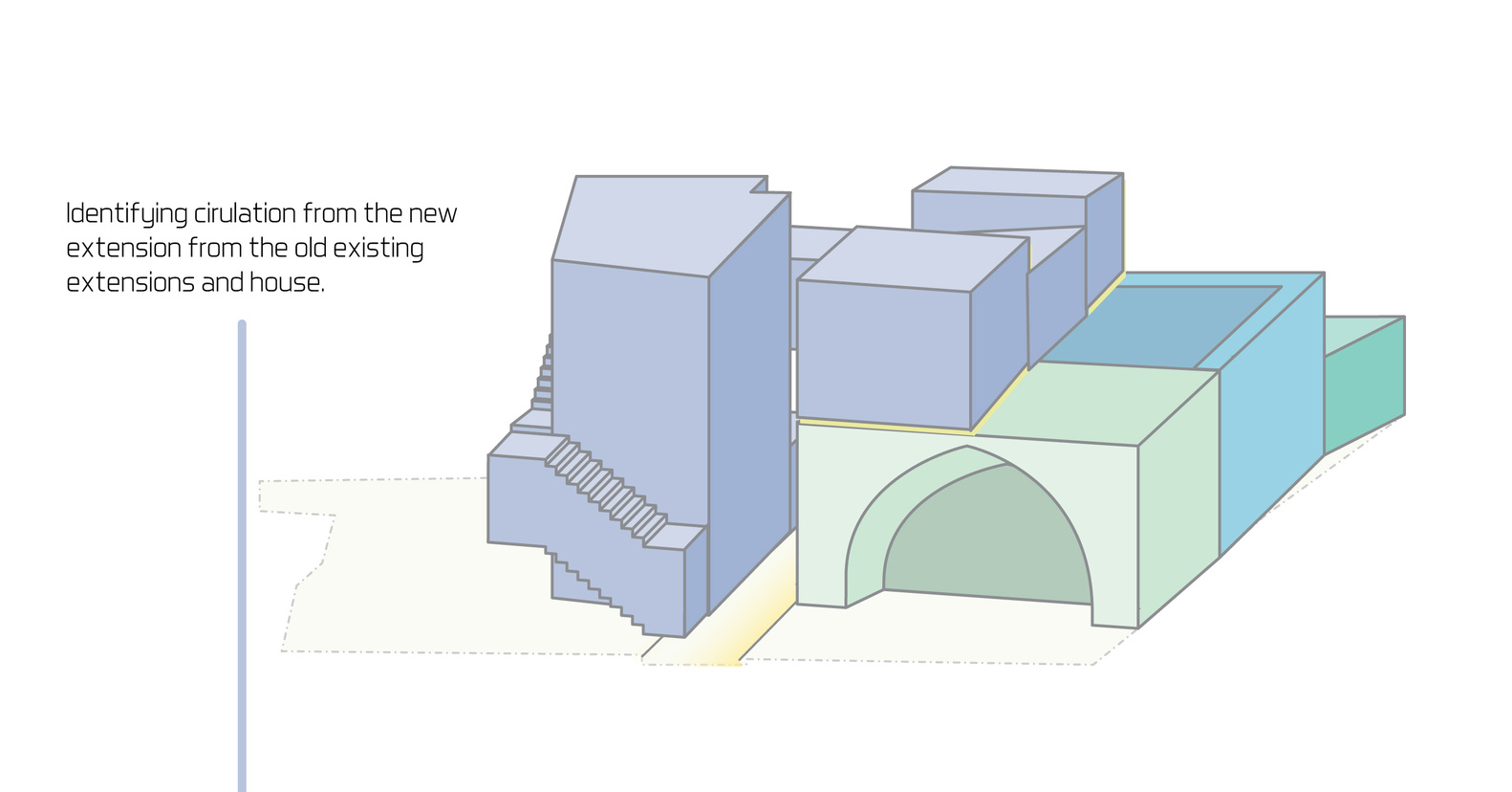 في الزيارة الأولى للموقع، كان الهدف وضع مقترحات تصميمية لإجراء تعديلات على المنزل. التعديلات بمجملها كانت عبارة عن توسعات وإضافة غرف على قطعة صغيرة من الأرض. كان واضحًا بأن الأسلوب القديم في البناء يميّز بين الحديقة والمنزل بالتكتيل ومواد البناء، فتجد بأنهما وسطين مختلفين. ويمكنك ملاحظة التعديلات الجديدة على البناء، والتعديلات هُنا “Extension” تعني أن تكون الإضافات على المبنى أصليةً ومع هذا، تُظهر الفرق بين الجزء المبني قديمًا والجزء الحديث من البناء. فهي وسيلة تجريبية للتعبير عن روح المباني القديمة وخصائصها. وخلال التنفيذ، لابد من تبنّي نهجًا يُحافظ على هذا الفصل بين الجزئين، ويربط الإضافات القديمة والجديدة بشكل واضح وقوي مع تسلسل الإختلافات بشكل تدريجي كالتعديلات على المدخل مثلًا، باعتباره نقطة التقاء بين الوسطين “المنزل والحديقة”.