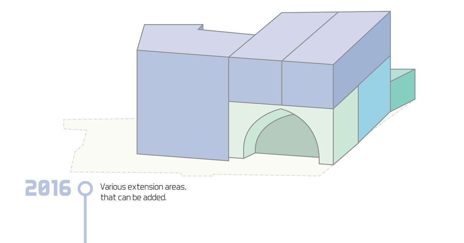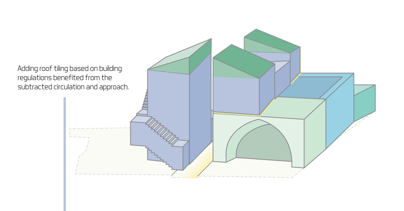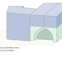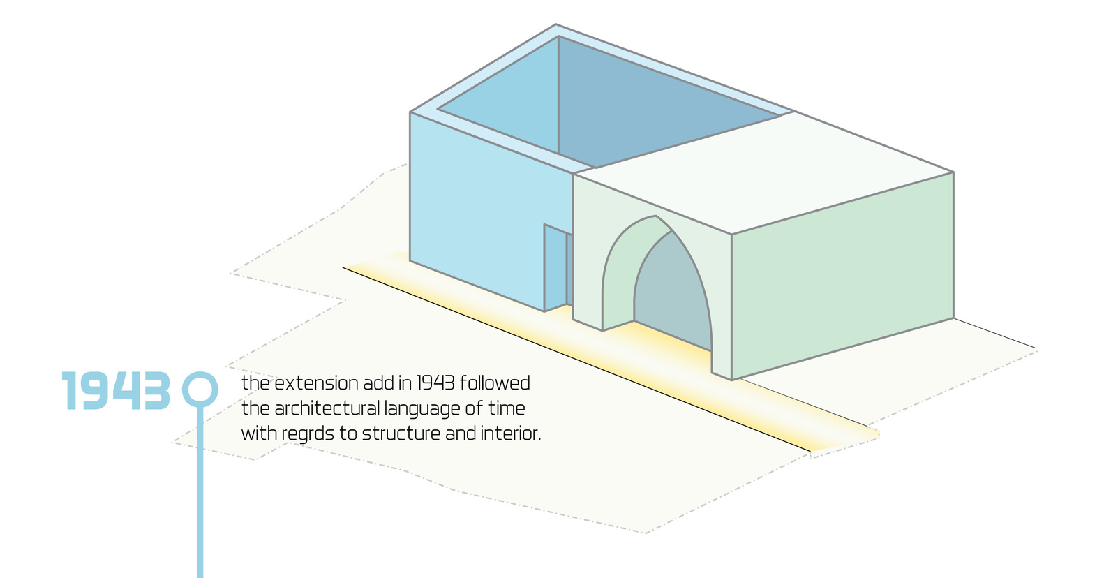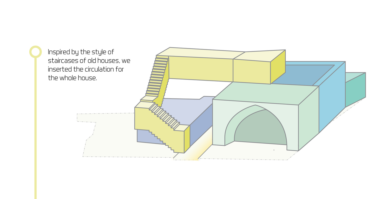 في الزيارة الأولى للموقع، كان الهدف وضع مقترحات تصميمية لإجراء تعديلات على المنزل. التعديلات بمجملها كانت عبارة عن توسعات وإضافة غرف على قطعة صغيرة من الأرض. كان واضحًا بأن الأسلوب القديم في البناء يميّز بين الحديقة والمنزل بالتكتيل ومواد البناء، فتجد بأنهما وسطين مختلفين. ويمكنك ملاحظة التعديلات الجديدة على البناء، والتعديلات هُنا “Extension” تعني أن تكون الإضافات على المبنى أصليةً ومع هذا، تُظهر الفرق بين الجزء المبني قديمًا والجزء الحديث من البناء. فهي وسيلة تجريبية للتعبير عن روح المباني القديمة وخصائصها. وخلال التنفيذ، لابد من تبنّي نهجًا يُحافظ على هذا الفصل بين الجزئين، ويربط الإضافات القديمة والجديدة بشكل واضح وقوي مع تسلسل الإختلافات بشكل تدريجي كالتعديلات على المدخل مثلًا، باعتباره نقطة التقاء بين الوسطين “المنزل والحديقة”.